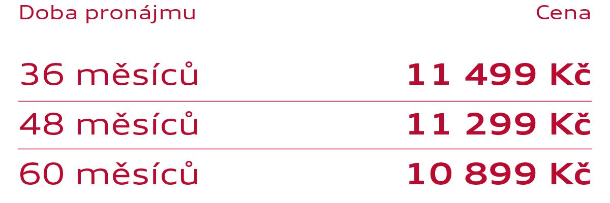 Informace k uvedeným cenám: jedná se o výše měsíční splátky platnou po celou dobu pronájmu při zvolených parametrech produktu. Ceny jsou uvedené bez DPH. Nabídka platí pouze pro podnikatele, ostatní zákazníci mohou získat více informací o dalších možnostech nabídky u svého autorizovaného prodejce Audi. Akce je množstevně a časově omezena.